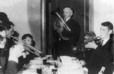 De gauche à droite : Georges Lorent, chef de 1971 à 1979 ; Arthur Flandre, chef de 1946 à 1971, et Amour Matagne, chef de 1979 à 2004, en train de jouer une arguedenne lors de la Sainte-Cécile en 1964.